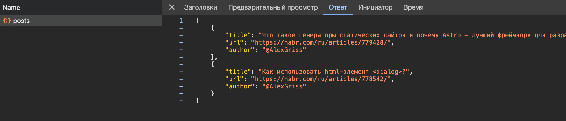 В приведённом примере вызывается метод HttpResponse.json(), в который передаётся моковая структура данных — в данном случае это коллекция постов на Хабре. Далее она будет отправлена на клиент при успешной обработке вызова.
