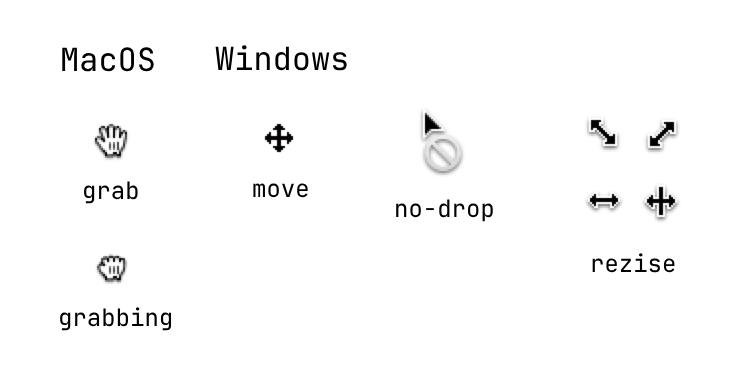Для работы с перетаскиваемыми элементами предусмотрены специальные состояния курсоров, которые отличаются для пользователей MacOS и Windows. Для MacOS необходимо использовать открытый курсор в состоянии grab при наведении на перетаскиваемый элемент, а при самом действии перетаскивания менять на закрытый курсор в состоянии grabbing. Для Windows принято использовать курсор в состоянии move для обоих действий. При пересечении перетаскиваемого элемента с теми зонами, где он не может быть сброшен, следует менять курсор на состояние no-drop.