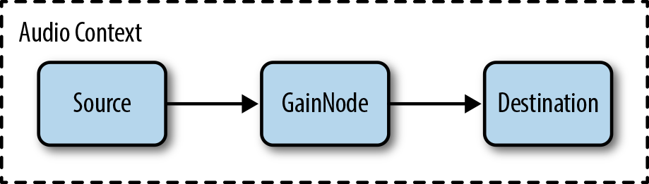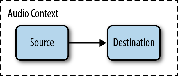 Web Audio API выстроен вокруг концепции аудиоконтекста. Аудиоконтекст — это ориентированный граф аудиоузлов, который определяет, как аудиопоток проходит от источника (чаще всего это аудиофайл) до финального аудиовыхода (например, к вашим колонкам). По мере прохождения аудио через каждый узел, его свойства могут меняться или подвергаться анализу. Самый простой аудиоконтекст — это прямая связь от узла источника к аудиовыходу (см. Рисунок 1-1).