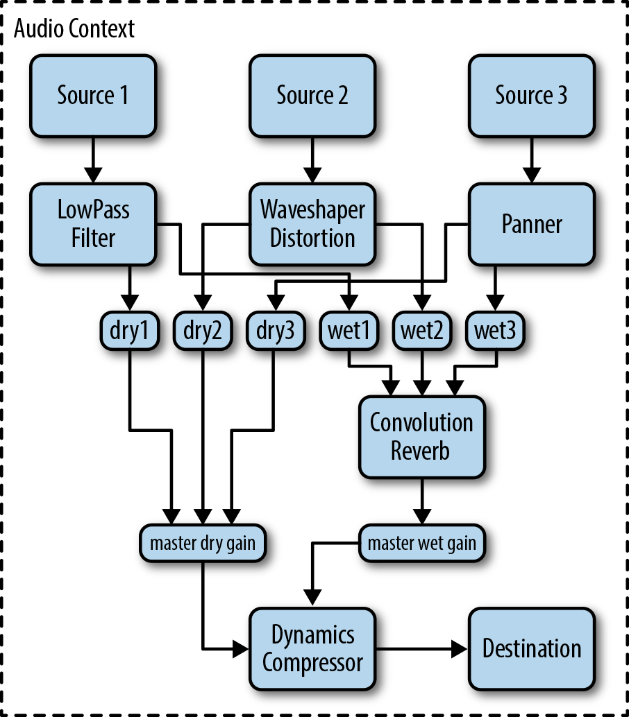 Аудиоконтекст может быть сложным, состоящим из множества узлов, работающих между источником и выходом звука (см. Рисунок 1-2), выполняющих продвинутый синтез или анализ аудио.