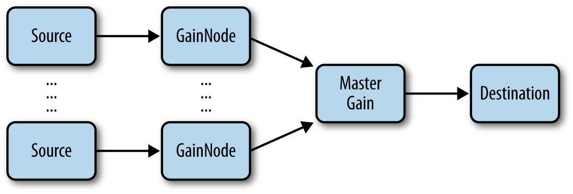 Во многих играх различные источники звука могут быть объединены в один для создания финального микса. Такими источниками могут быть: фоновая музыка, звуковые эффекты, звуки интерфейса, и даже голосовой чат в мультиплеер-играх. Web Audio API позволяет разделить все эти каналы и даёт полный контроль над каждым каналом отдельно и над всеми вместе. Граф обработки аудио для такой системы может выглядеть как на Рисунке 1-4.