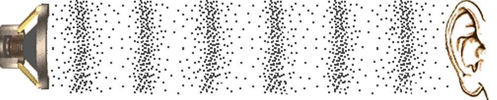 С точки зрения физики, звук — это продольная волна (иногда называемая волной давления), которая распространяется в воздухе или другой среде. Источник звука заставляет молекулы воздуха вибрировать и сталкиваться друг с другом. В результате возникают области повышенного и пониженного давления, которые чередуются, сходятся и расходятся в виде полос. Если бы можно было изобразить узор звуковой волны, остановленной во времени, он мог бы выглядеть как на Рисунке 1-5.