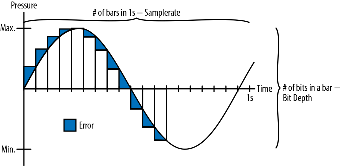 Мы можем перевести аналоговый звук в цифровой посредством его семплирования — то есть измерения частоты аналогового сигнала через небольшие отрезки времени. Далее мы можем закодировать сигнал в каждом семпле в виде конкретного числа. Частота таких измерений аналогового сигнала называется частотой дискретизации. Самая распространенная частота дискретизации — 44.1 kHz. Это означает, что для каждой секунды звука записывается 44 100 чисел. Сами числа находятся в определённом диапазоне значений. Каждому значению обычно выделяется определённое количество битов — это называется глубиной битности. В большинстве случаев для цифровой аудиозаписи, включая CD-диски, используется глубина 16 бит, которой обычно достаточно для большинства слушателей. Аудиофилы могут предпочитать 24-битную глубину, которая обеспечивает такую точность, выше которой человеческое ухо уже перестаёт улавливать какую-либо разницу.