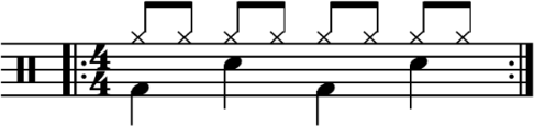 Web Audio API позволяет разработчикам точно планировать воспроизведение в будущем. Давайте настроим простой ритмический трек, чтобы это продемонстрировать. Возможно простейший и самый известный ритмический паттерн (см. Рисунок 2-1) — это хай-хет, который играется каждую восьмую ноту и кик со снэйром, которые играются чередующимися четверными нотами в тактовом размере 4/4.