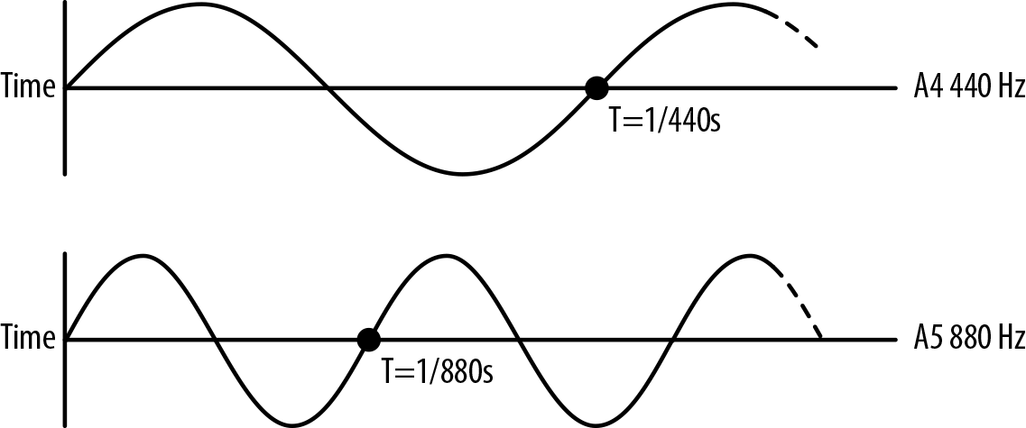 Музыка состоит из множества звуков, воспроизводимых в разное время и одновременно. Звуки, которые извлекаются из музыкальных инструментов, могут быть очень сложными, так как звук отражается от разных частей инструмента и его форма становится уникальной. Однако эти музыкальные тоны имеют одну общую черту: физически они представляют собой периодические волновые формы. Эта периодичность воспринимается нашими ушами как высота звука. Высота измеряется частотой колебаний волны или числом повторений волнового рисунка в секунду, которое указывается в герцах. Частота — это время (в секундах) между гребнями волны. На Рисунке 4-1 видно, что, если мы разделим волну пополам по шкале времени, то получим удвоенную частоту, которая будет звучать как исходный тон, но на одну октаву выше. И наоборот, если уменьшить частоту волны в два раза, тон понизится на октаву. Таким образом, высота звука (как и громкость) воспринимается ушами экспоненциально: на каждой октаве частота удваивается.